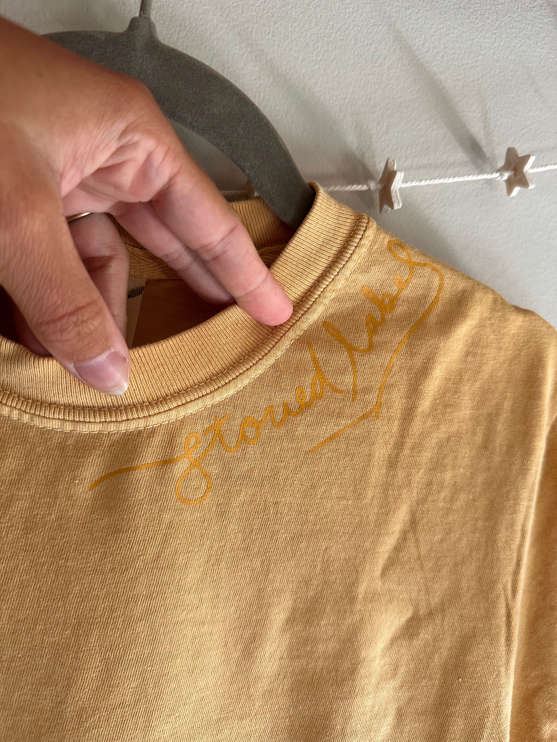 Goldenrod Storied Tees feature upcycled 100% cotton heavyweight boxy garment dyed comfort colors “seconds” tees with hand drawn logos designed, cut, and pressed on at home with compostable vinyl. Vinyl will only compost after being subjected to a true composting environment.
